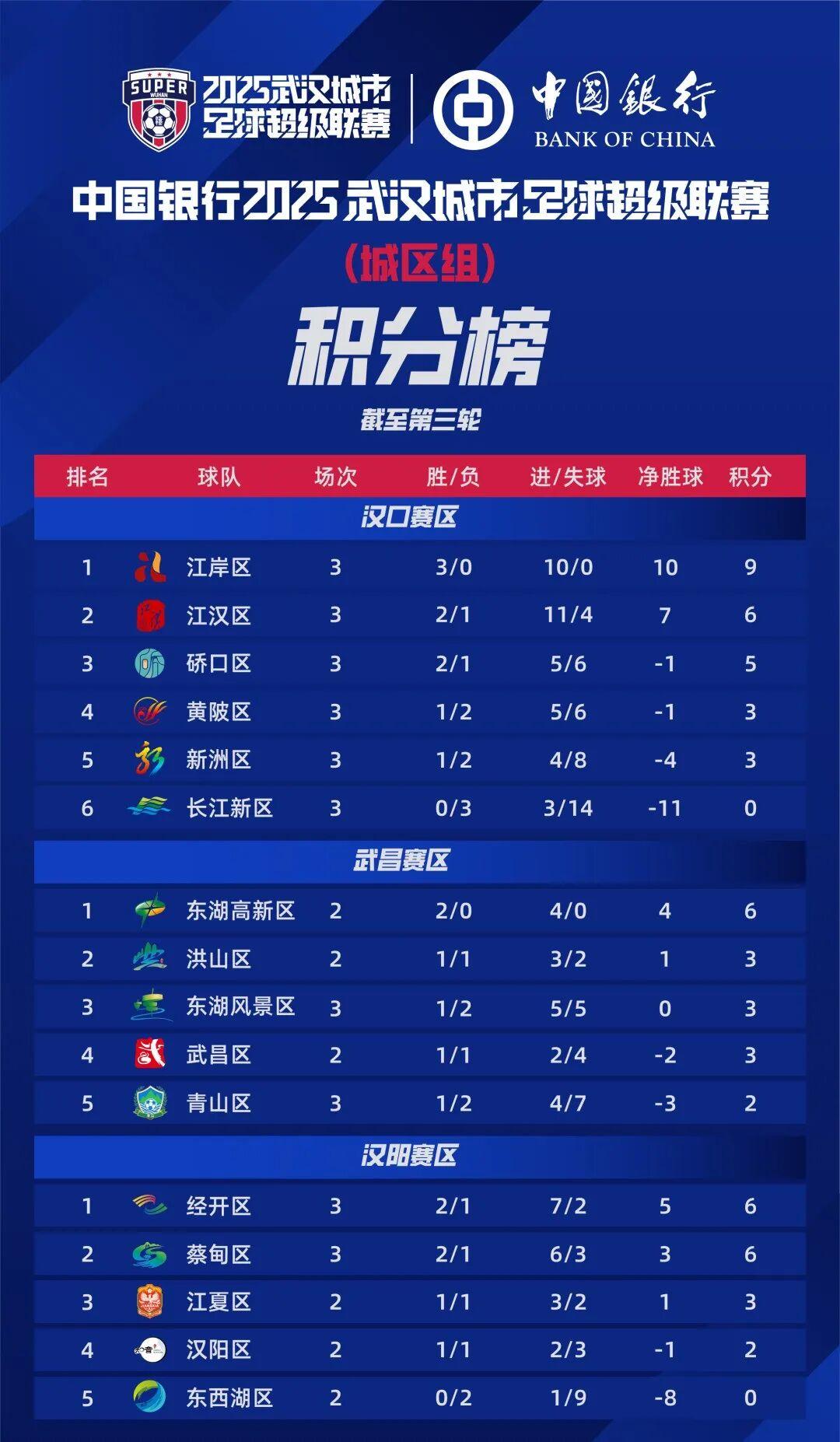 截至第三轮,江岸区以净胜球10个,总积分9分位居武汉赛区榜首,遥遥领先;长江新区、东西湖区垫底,积分为0。