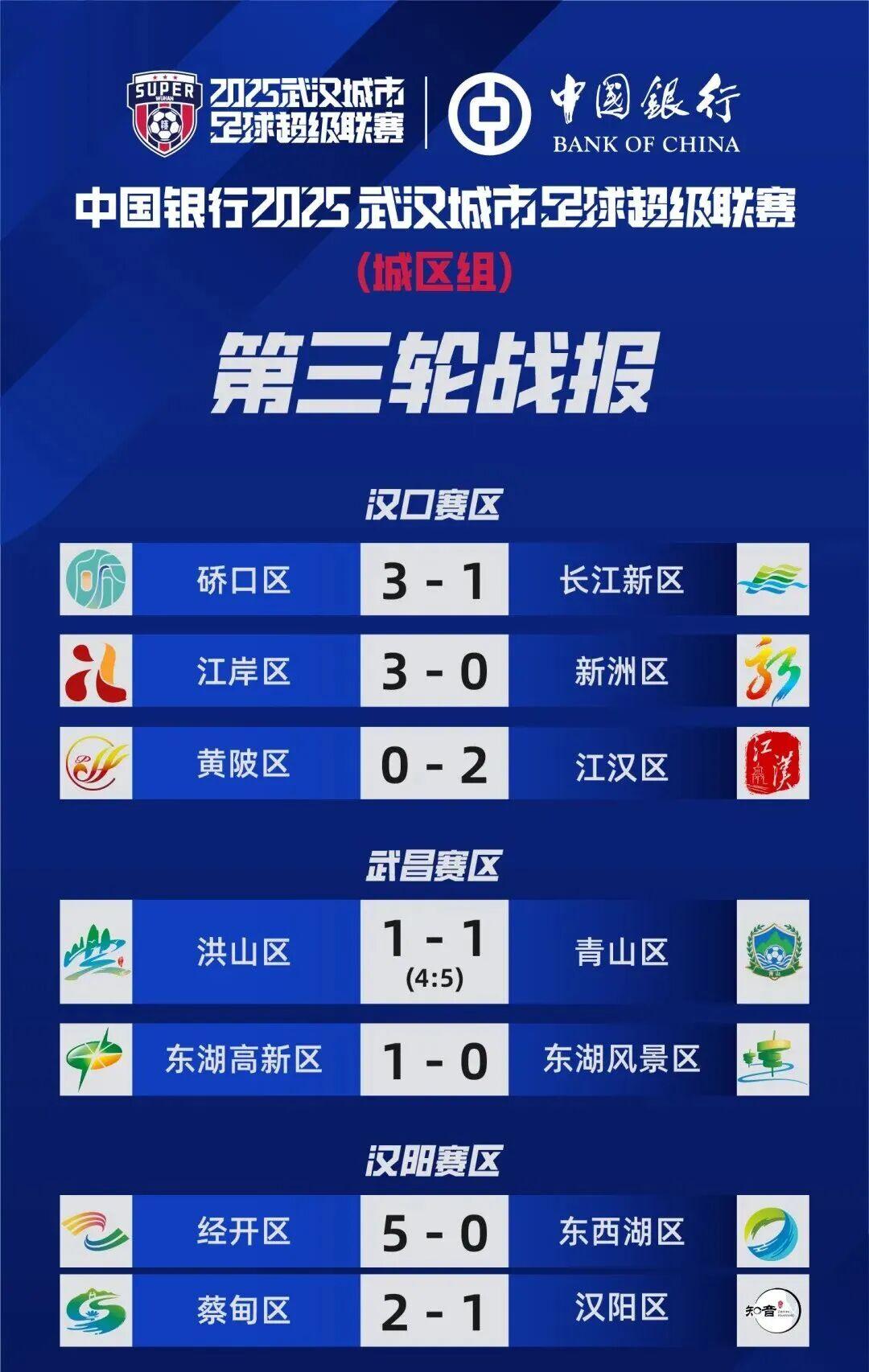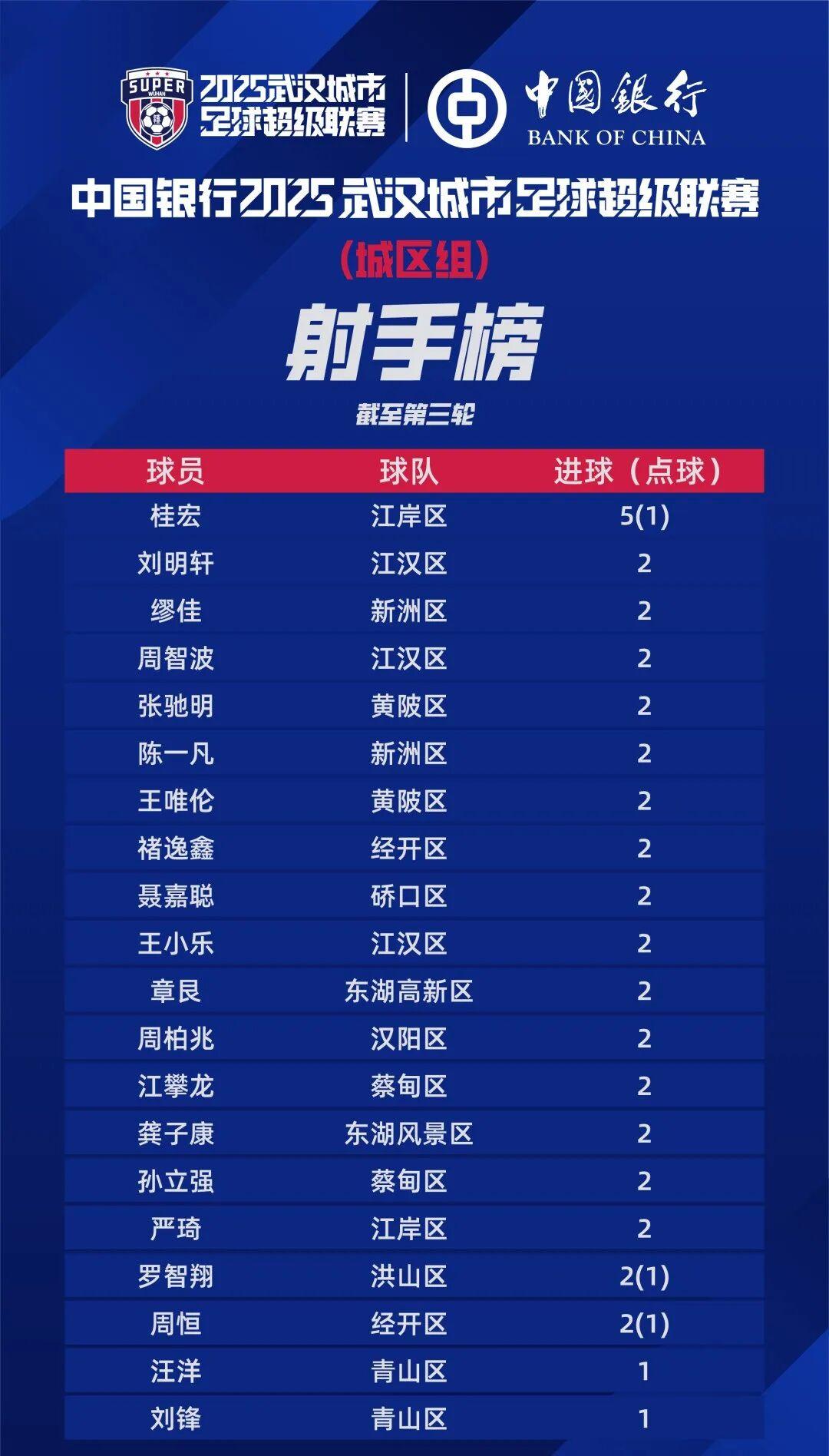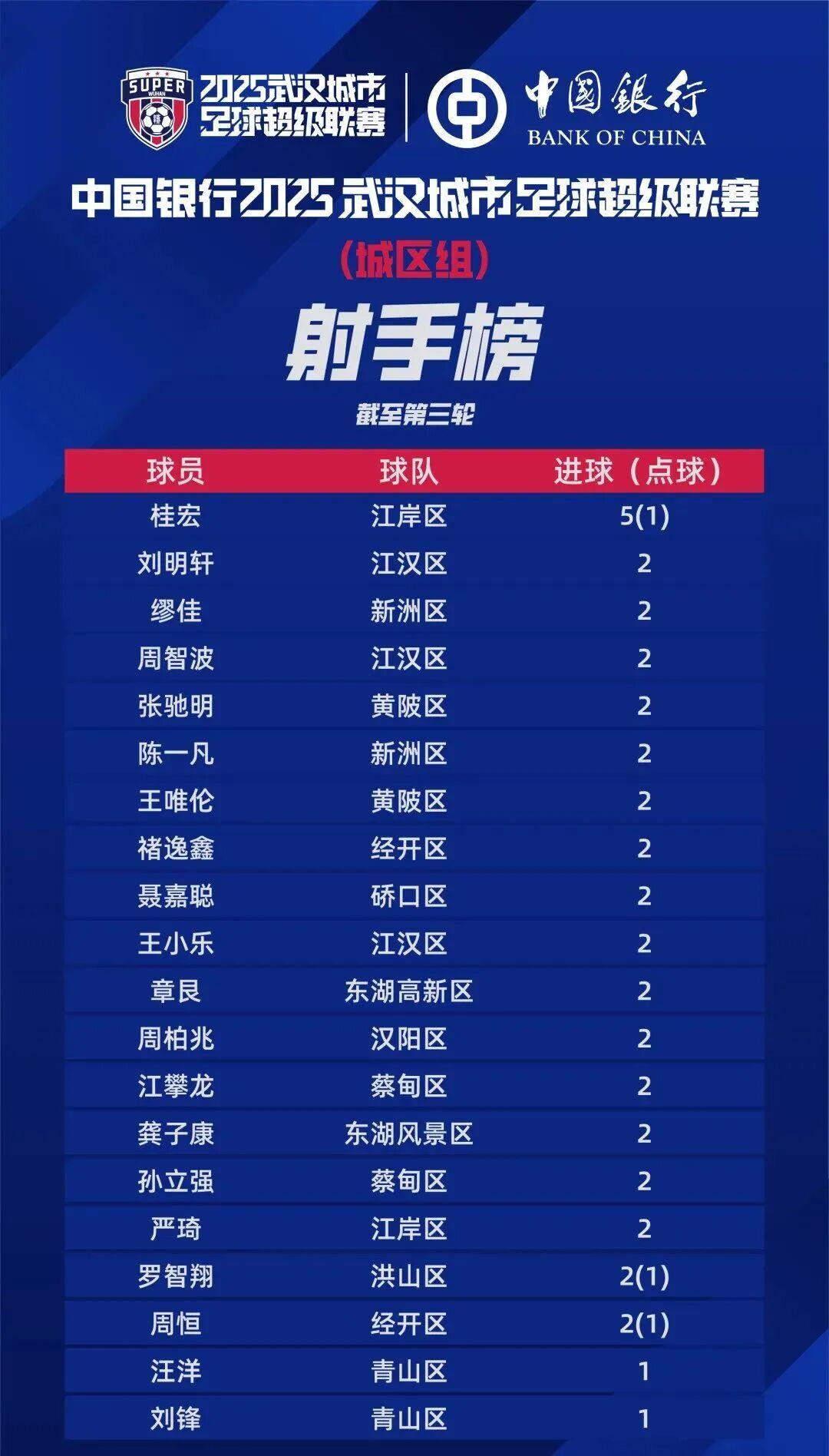 获悉,2025武汉城市足球超级联赛第三轮战报、积分榜(16个区)、射手榜公布。
